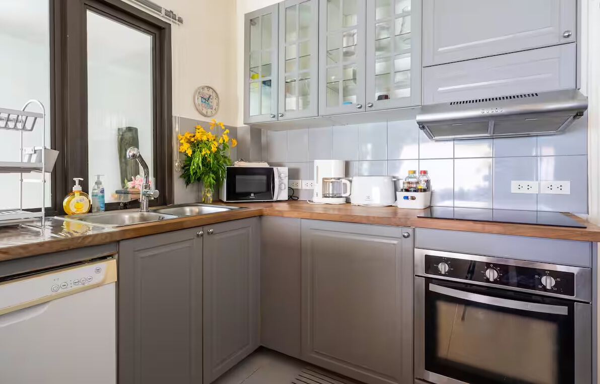 The main living area features a bright open-plan layout combining the living room, dining area, and a fully equipped Western kitchen. Large sliding glass doors allow natural light to flood the interior and open directly onto a covered terrace, the infinity pool, and the beachfront garden. This seamless indoor-outdoor design makes the villa ideal for entertaining, relaxing, or simply enjoying the beautiful sea views.
