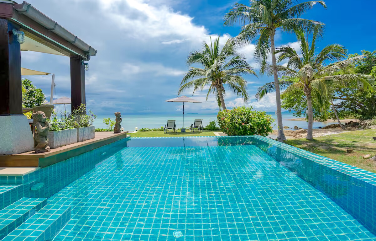 This homely Koh Samui beachfront villa for sale is a beachfront 4-bedroom pool villa located in the peaceful area of Ban Makham on the island’s west coast. Offering breathtaking sunset views across the Gulf of Thailand, this beautiful villa sits directly on a quiet stretch of beach, creating an exceptional opportunity for buyers seeking a true beachfront lifestyle within the Koh Samui real estate market.