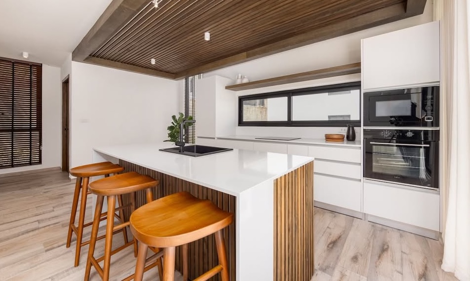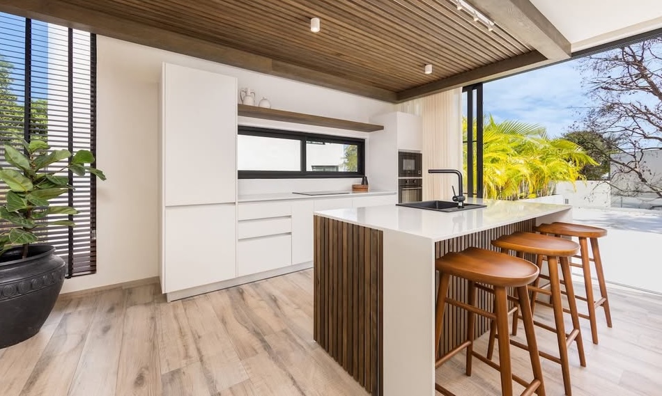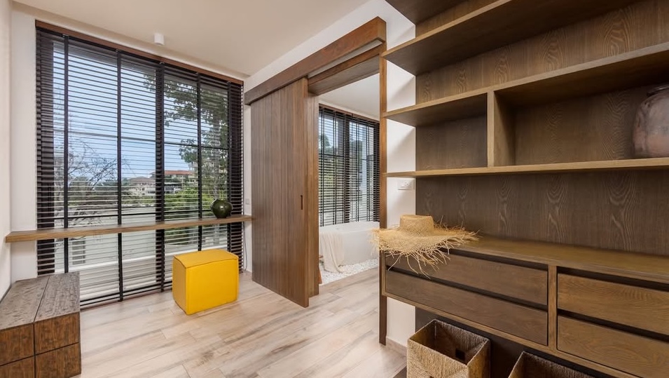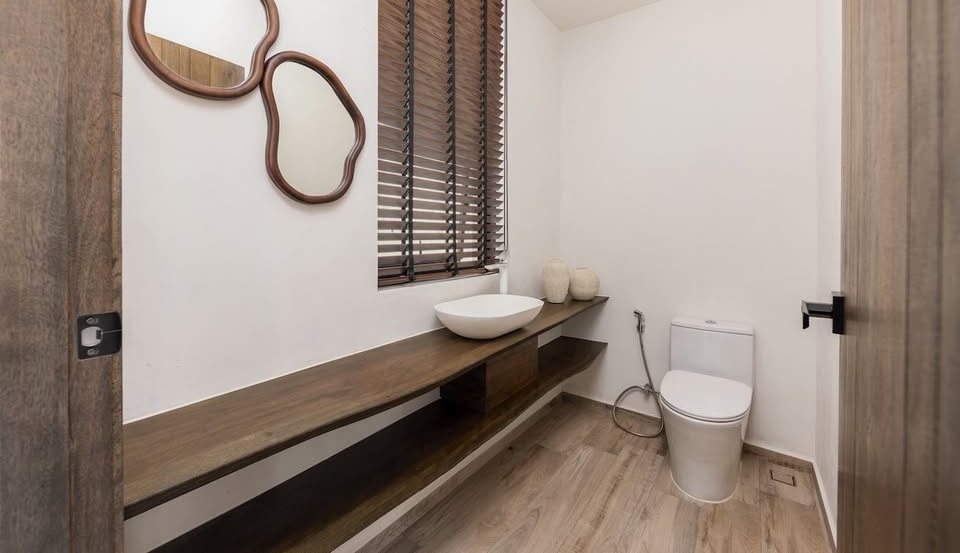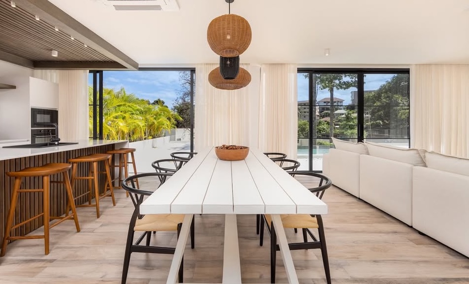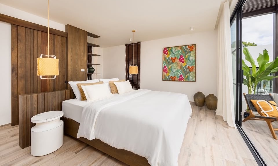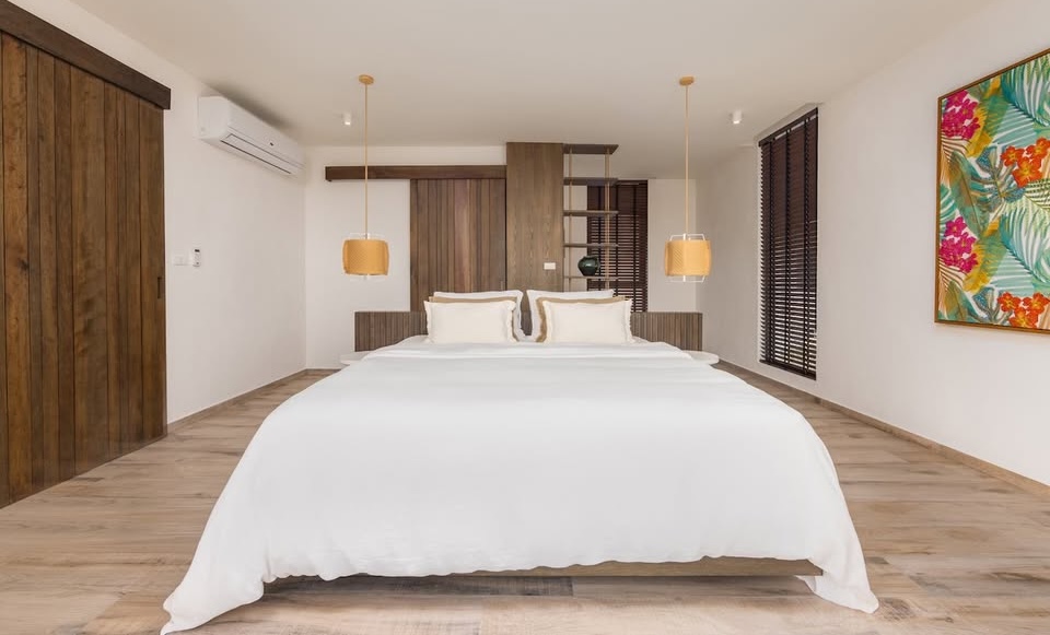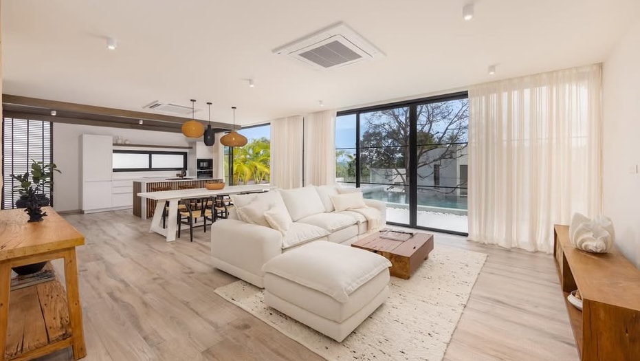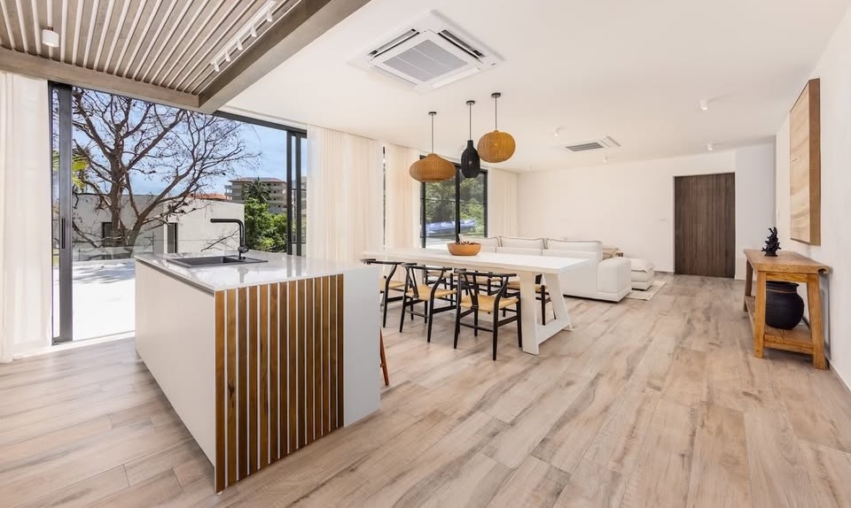The center of this designer home is a magnificent open-plan living and dining sanctuary, anchored by a gourmet kitchen and a sleek breakfast bar. This turnkey property comes fully furnished to an exceptional standard, showcasing bespoke acacia-wood furniture and a contemporary-rustic interior aesthetic. Floor-to-ceiling sliding glass doors and soft linen drapery emphasize the organic textures throughout, while the climate-controlled living spaces ensure absolute comfort in the tropical climate.
