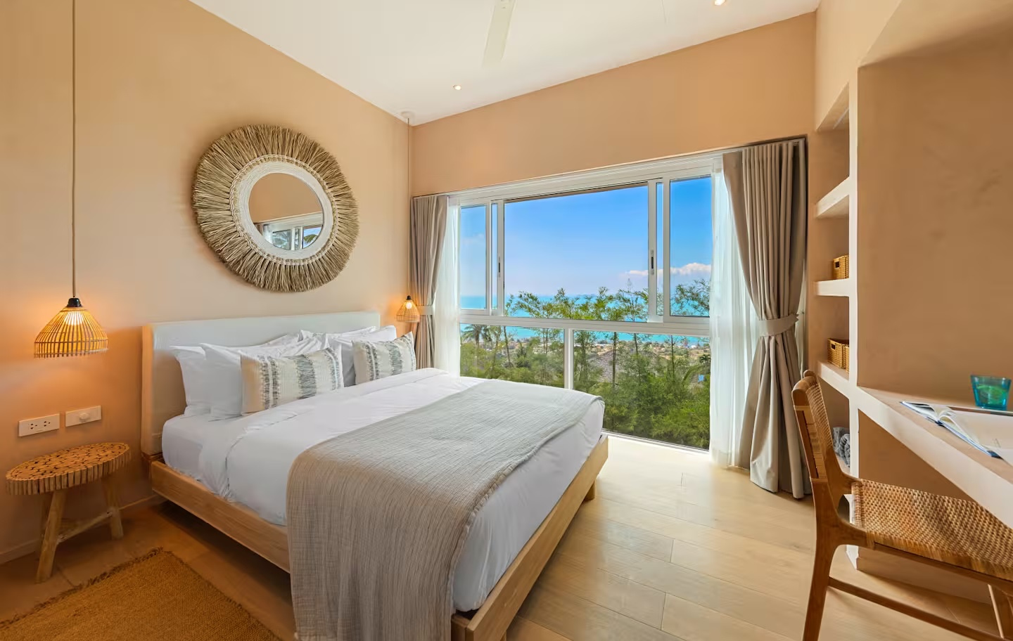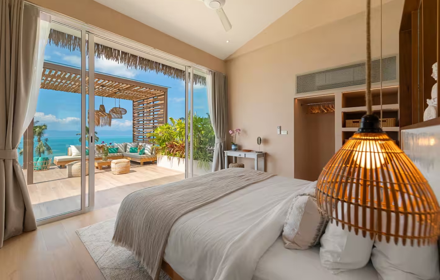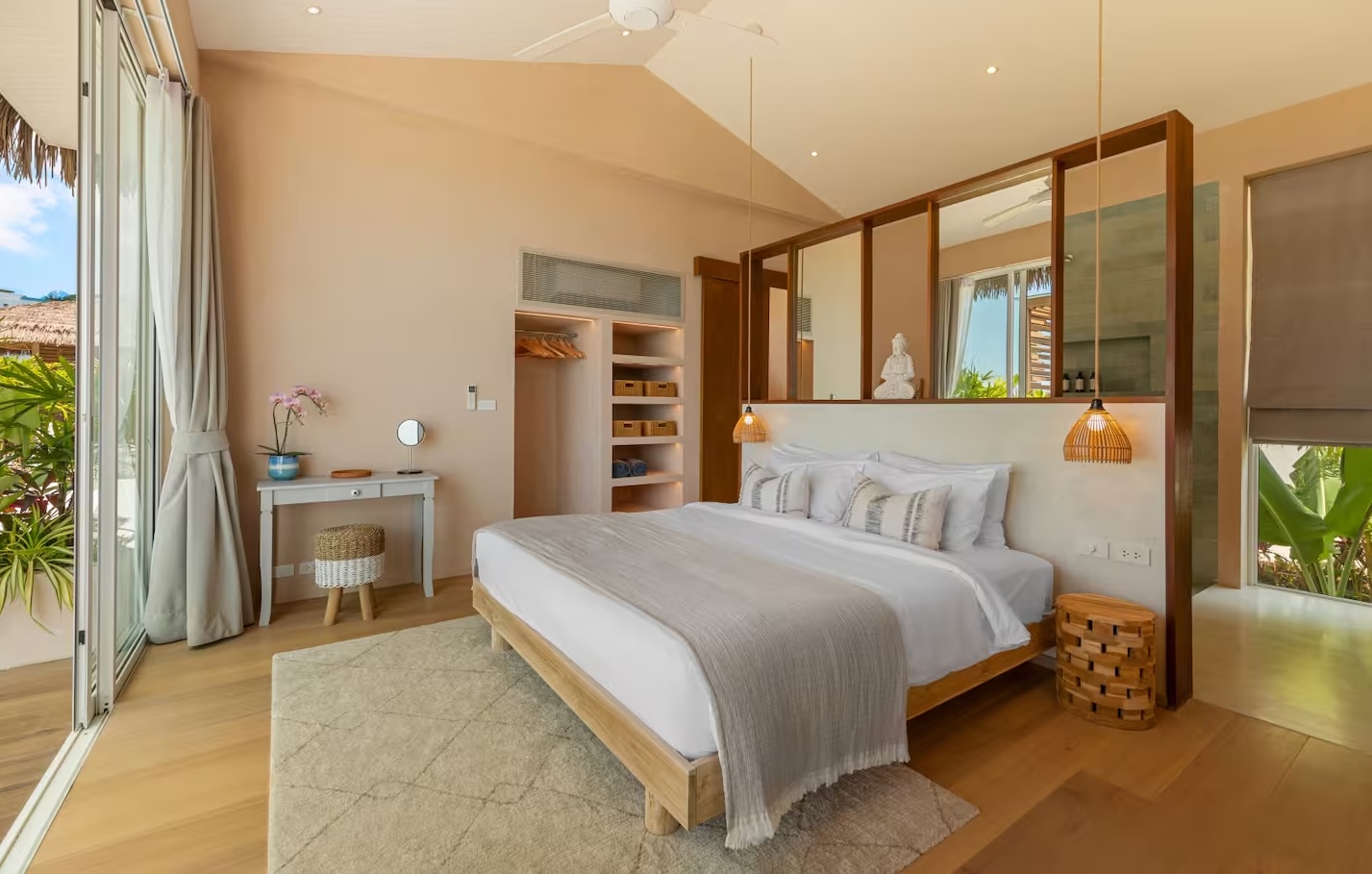 The bedrooms are thoughtfully designed for space, relaxation, and work, maintaining the villa's signature combination of sleek white décor and natural wood with high ceilings. Each suite includes a lavish, fully-featured en suite bathroom and a small private terraced area—perfect for enjoying the ocean views and tropical greenery just steps from the infinity pool.