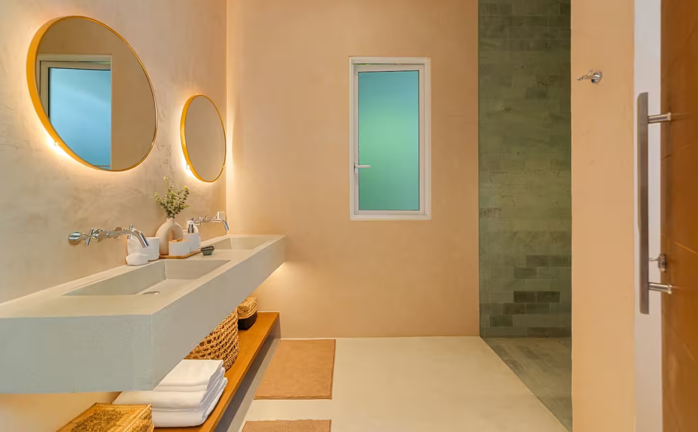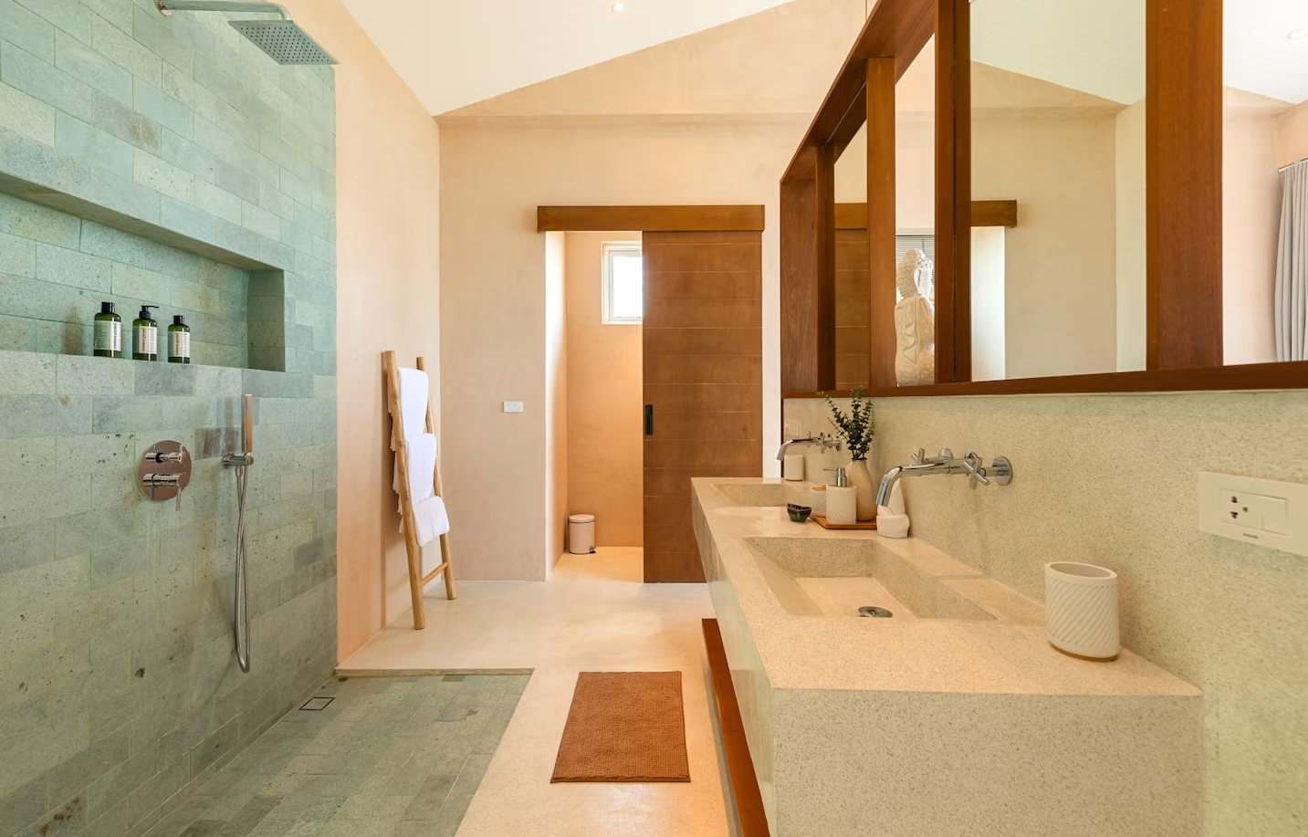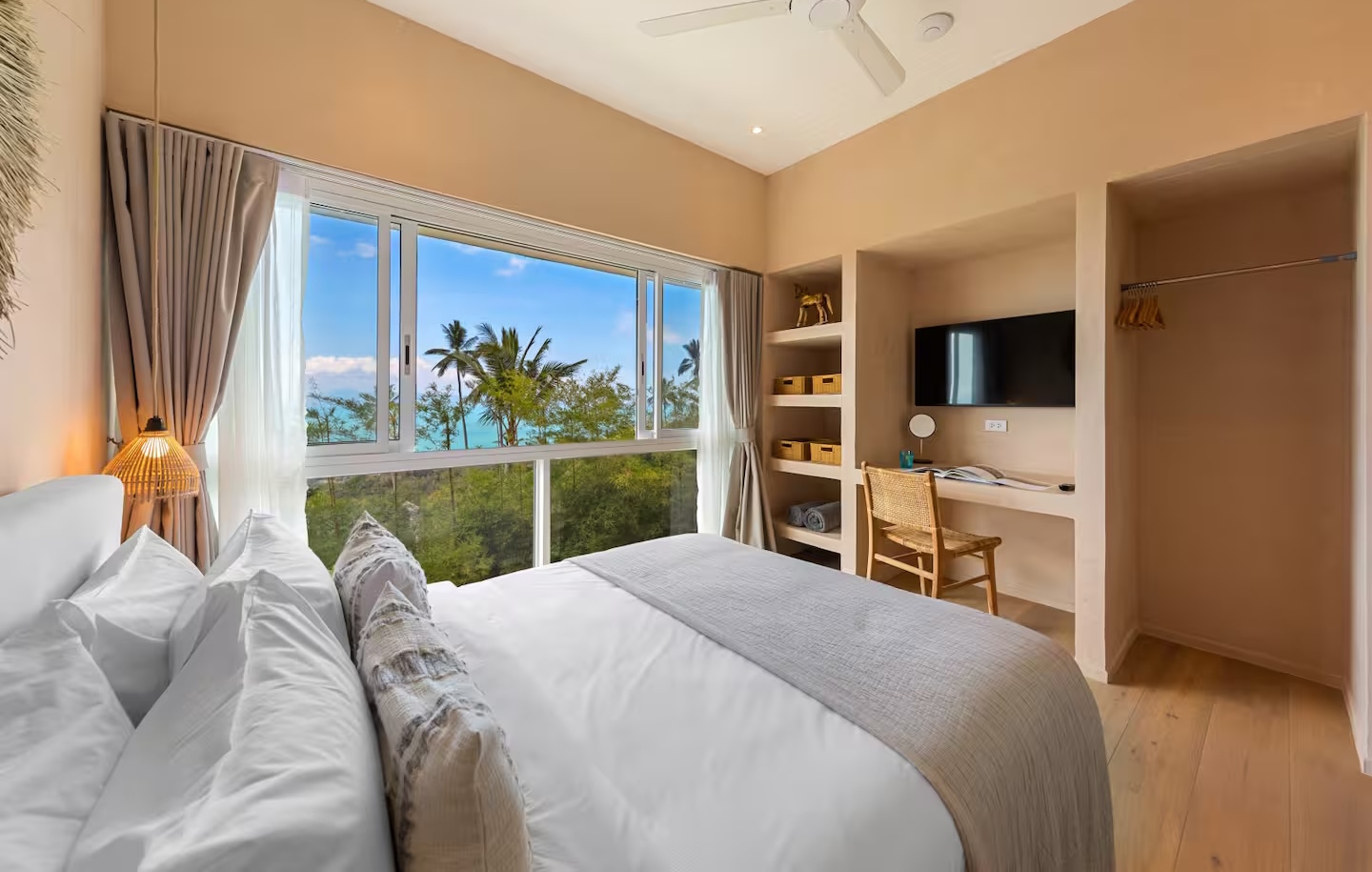 The bedrooms are thoughtfully designed for space, relaxation, and work, maintaining the villa's signature combination of sleek white décor and natural wood with high ceilings. Each suite includes a lavish, fully-featured en suite bathroom and a small private terraced area—perfect for enjoying the ocean views and tropical greenery just steps from the infinity pool.