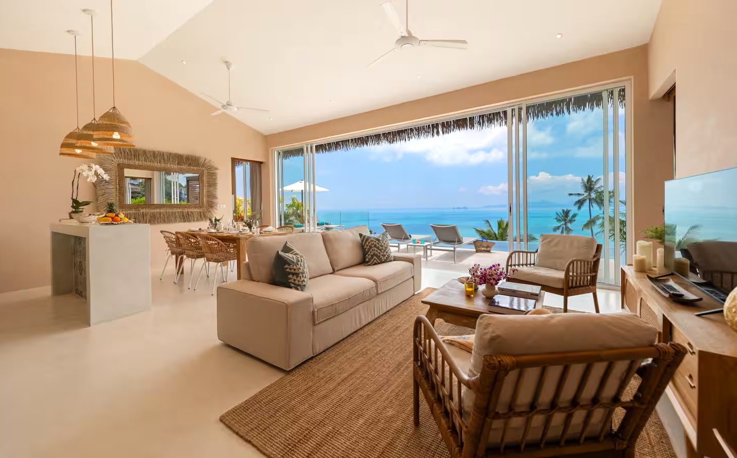 The central living area features a contemporary, sleek white palette complemented by warm natural wood fixtures. It effortlessly combines a comfortable lounge, dedicated dining space, and a fully equipped modern kitchen, creating an inviting yet uncluttered ambience. This central social hub flawlessly extends to the stylish pool terrace.