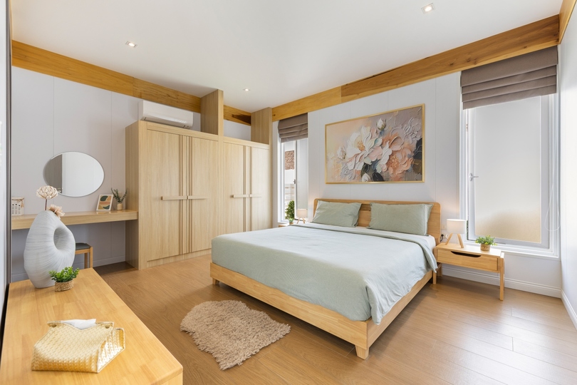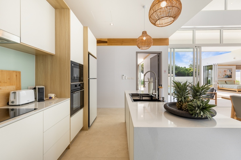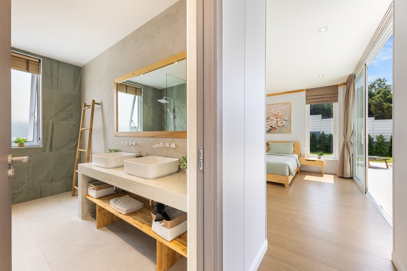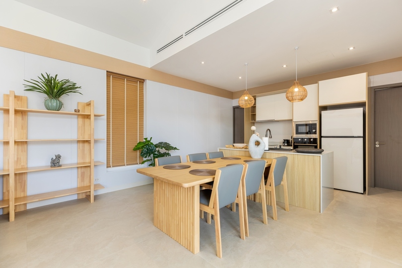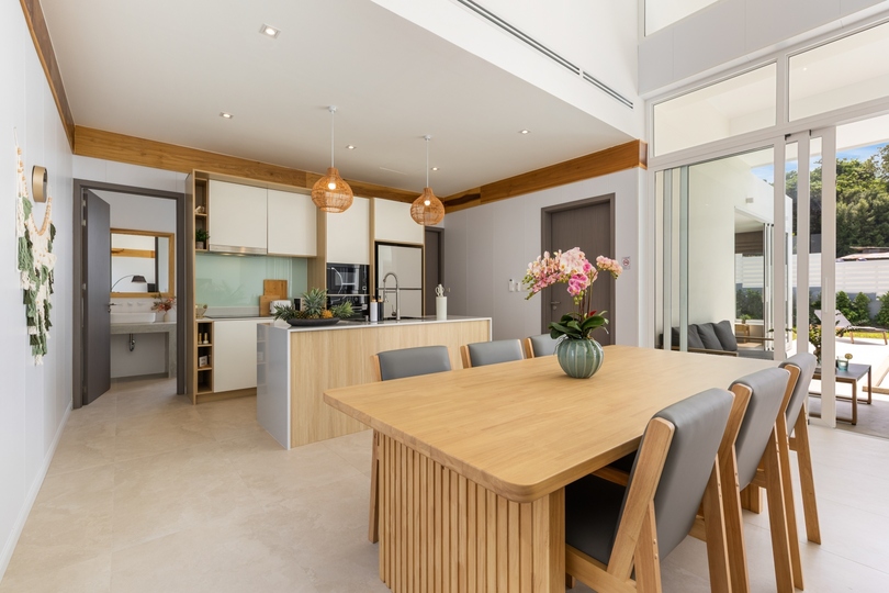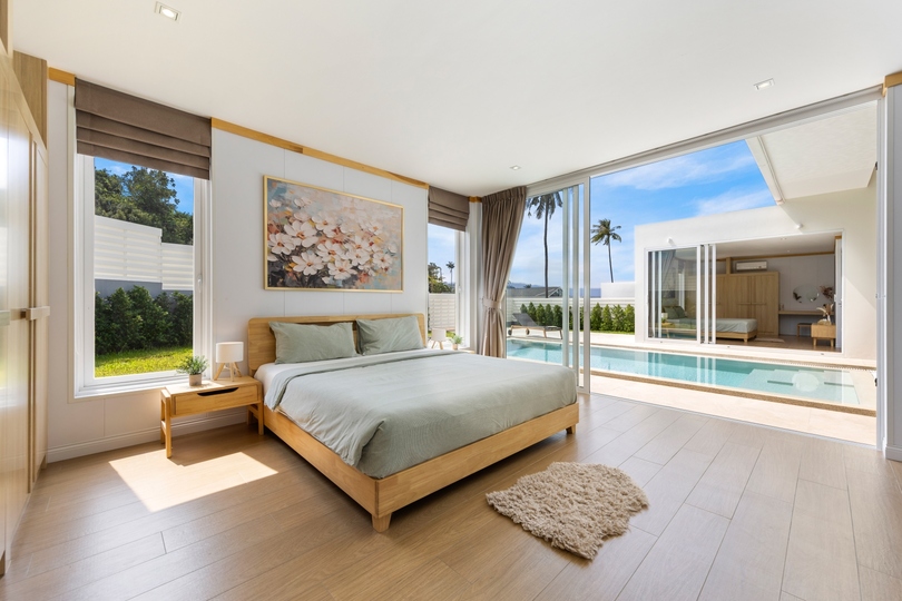 The interior design features seamless transitions between the expansive dining areas and a chef-grade fully equipped kitchen, making it ideal for both intimate family life and hosting sophisticated gatherings. Architectural highlights include high vaulted ceilings and floor-to-ceiling windows that emphasize the sophisticated neutral palette. All three generously sized bedrooms serve as private havens with built-in storage; notably, the master suite offers direct pool access and a spa-inspired en-suite bathroom finished with premium fixtures, embodying the finest in Koh Samui real estate.