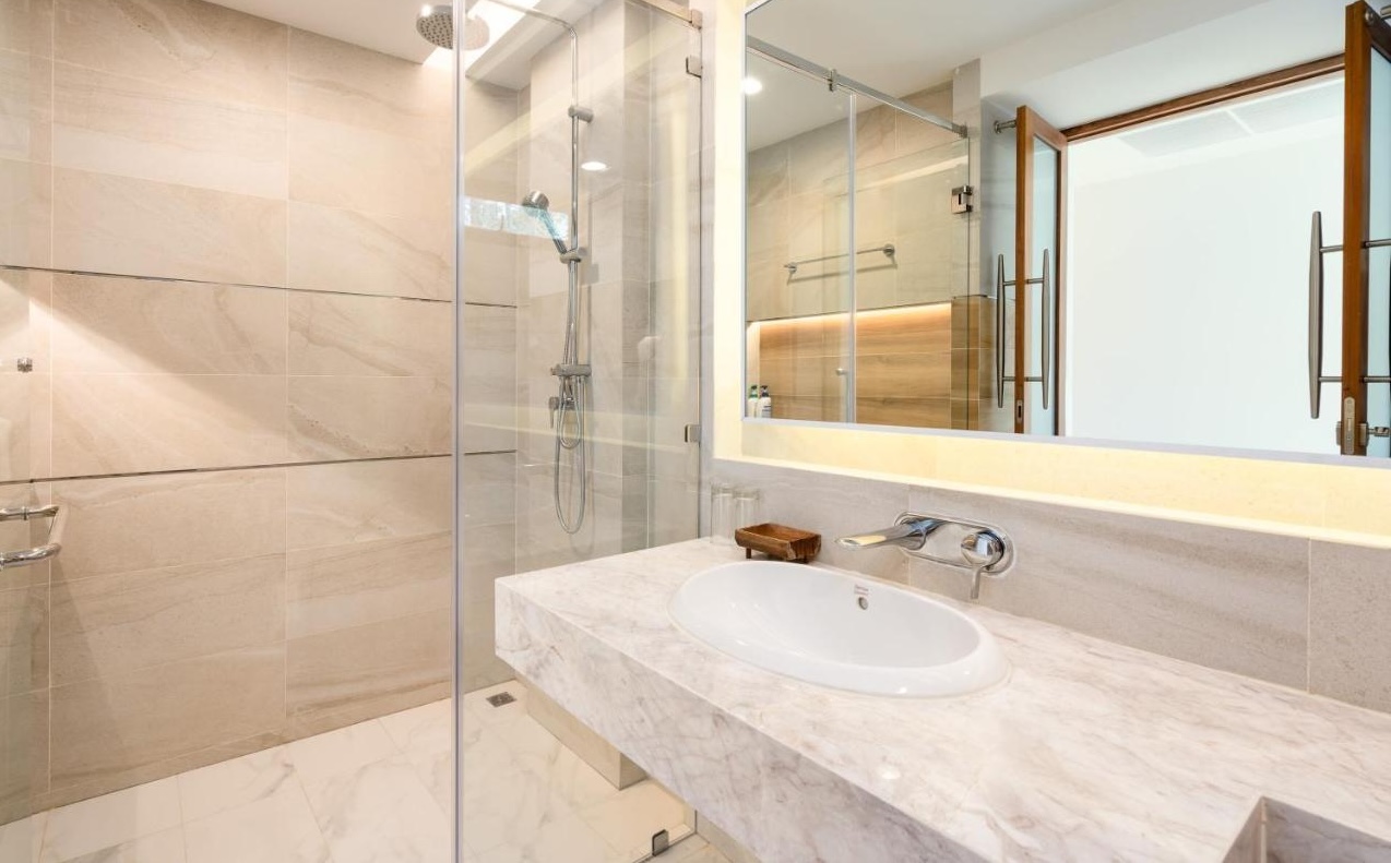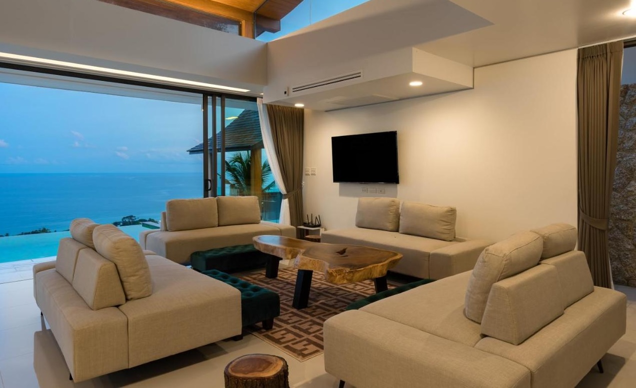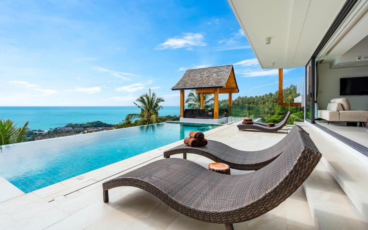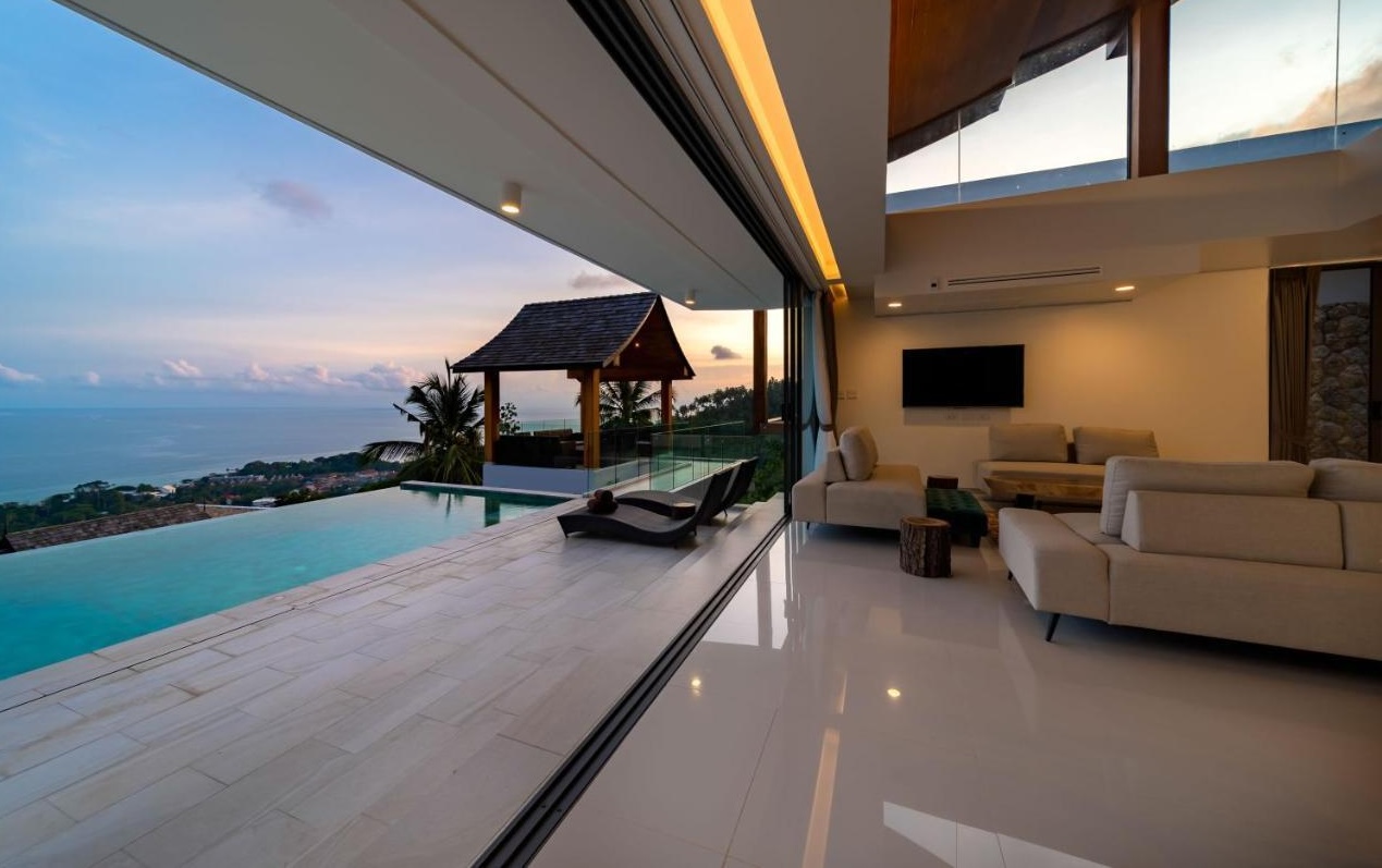 Through expansive patio doors, you step onto the elegant pool deck, which features a stunning infinity-edge swimming pool and a tranquil Thai-style sala the perfect setting for relaxation or entertaining while soaking in the ocean vista.