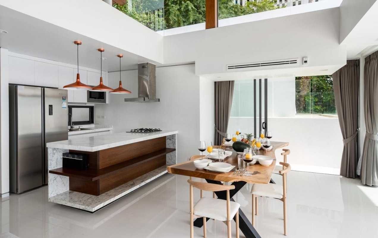 The villa’s design emphasizes seamless indoor-outdoor luxury. The heart of the home is a spacious, open-plan living and dining area that flows effortlessly into a modern, fully equipped Western kitchen.