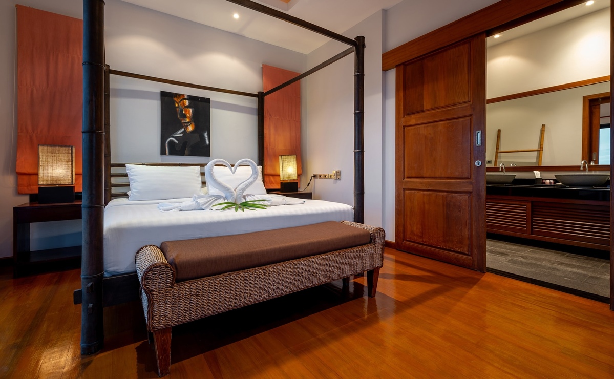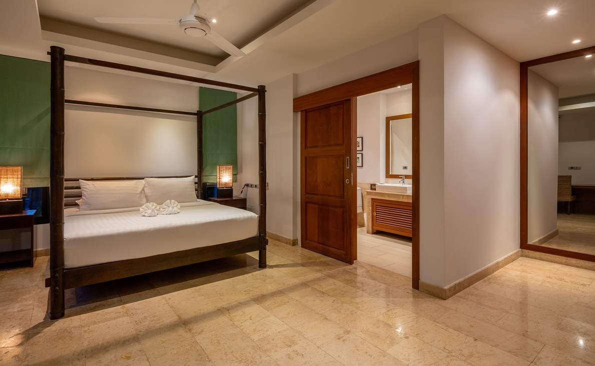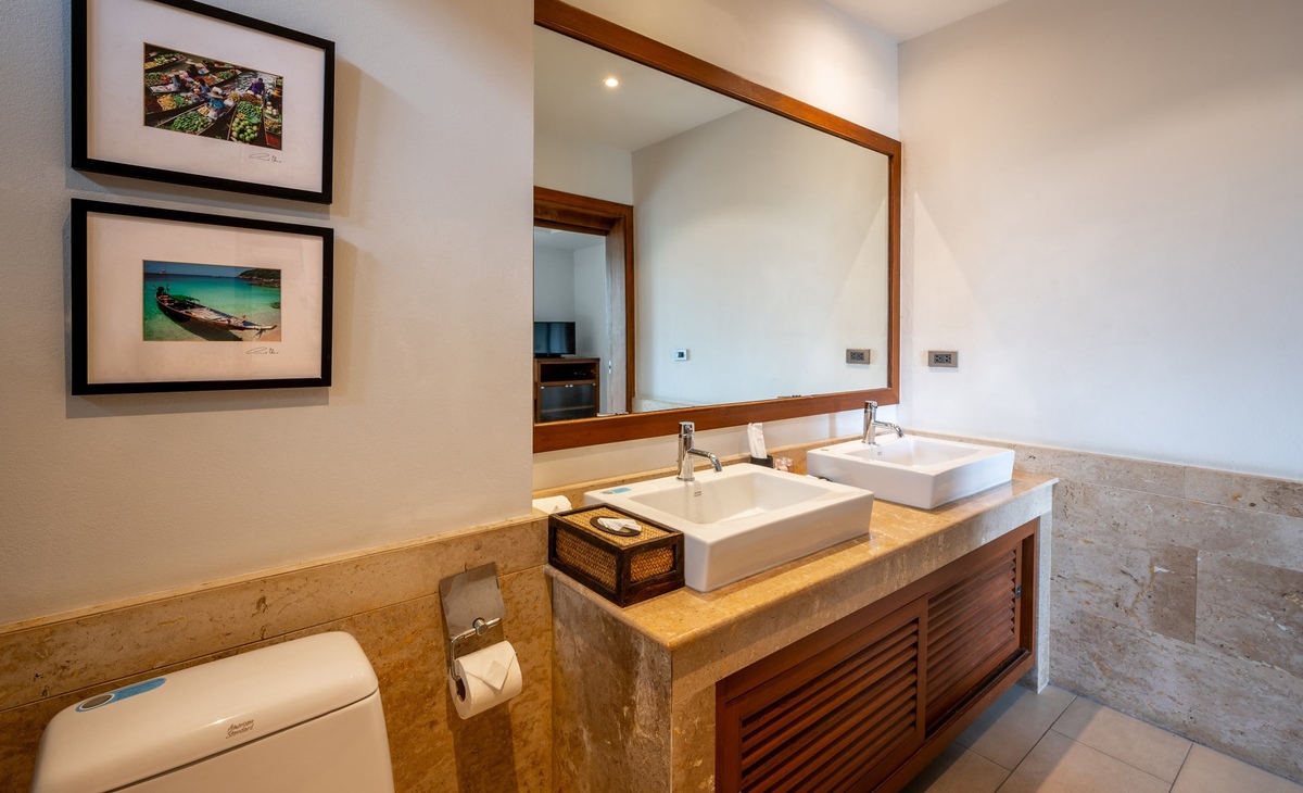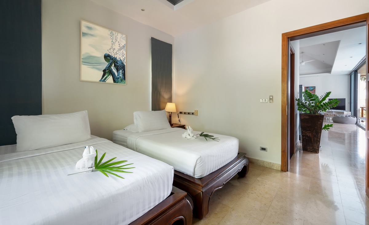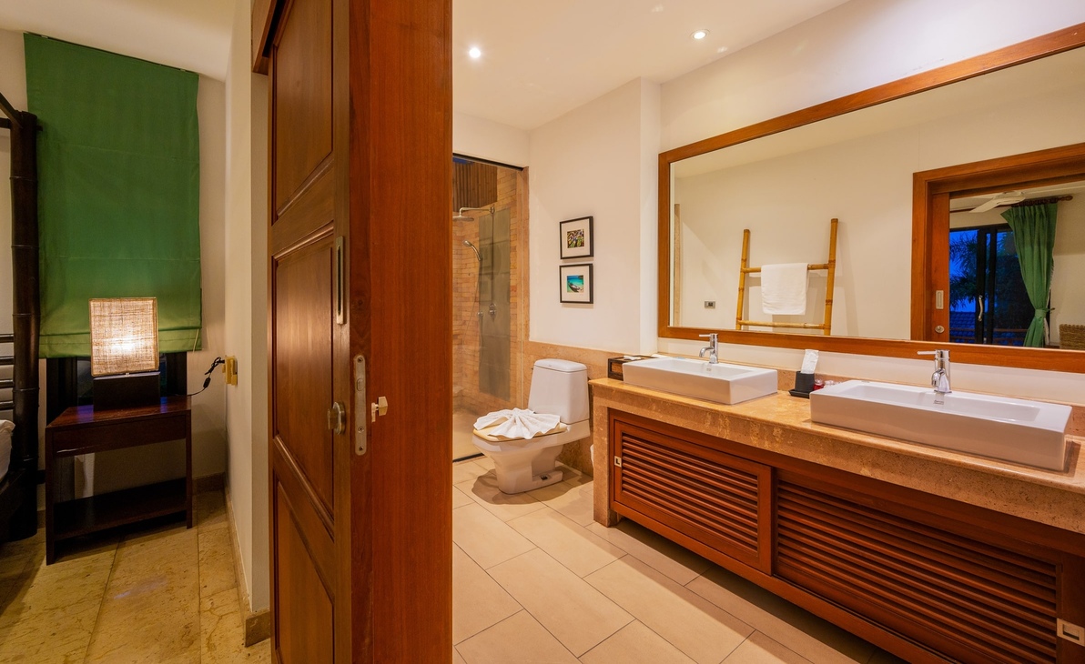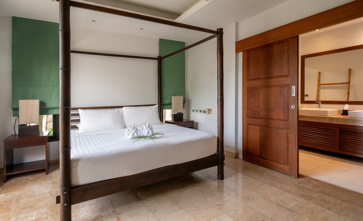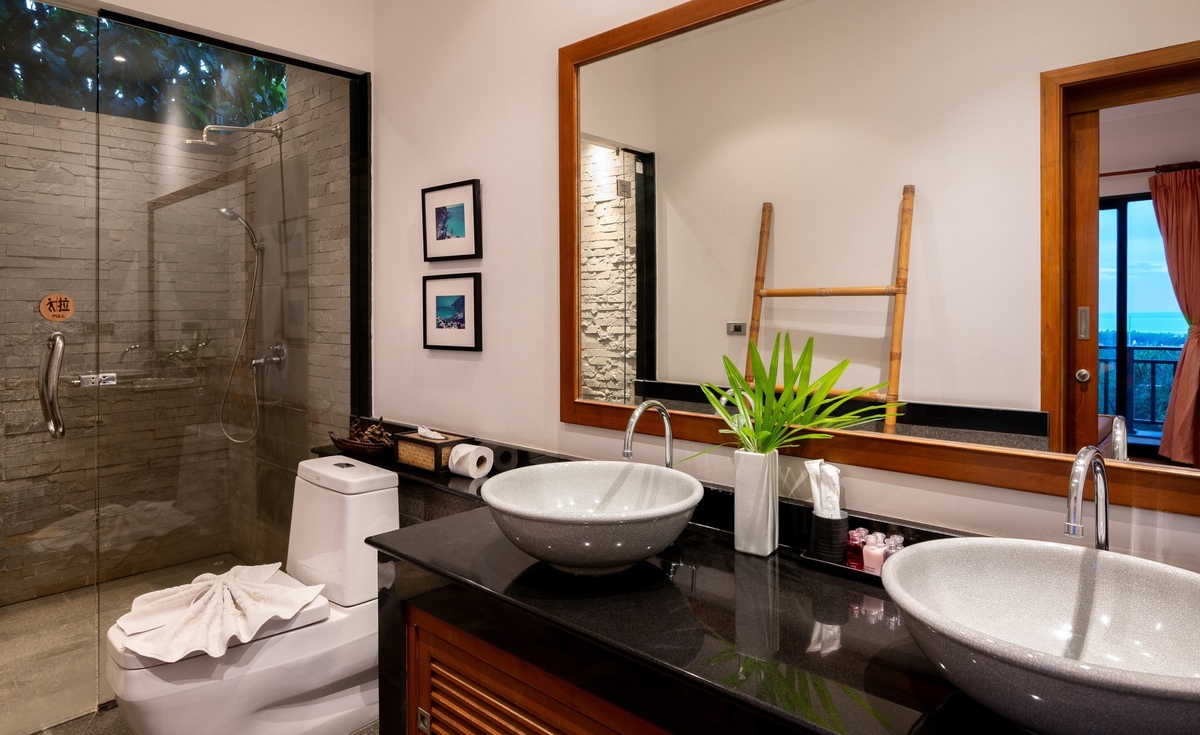 Architecturally designed to follow the natural contours of the hillside, this 3-bedroom, 3.5-bathroom home maximizes every inch of its layout. The bedrooms are strategically located on the pool and lower levels, each finished in light tones and natural wood with integrated wardrobes and desk space. The property features two lavish semi-open en-suite bathrooms complete with invigorating outdoor showers. Throughout the home, smooth polished wood and stone floors complement the organic wood fixtures, creating a warm and inviting atmosphere.