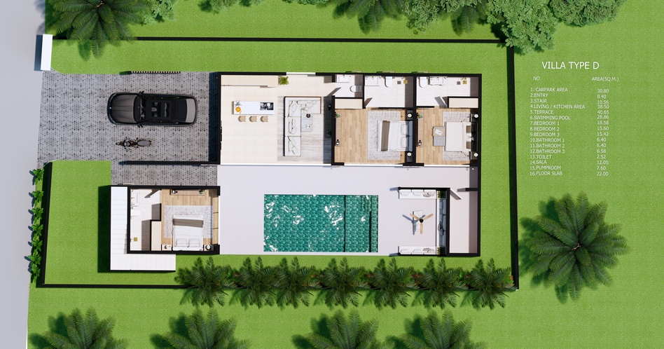 Relax by your private swimming pool featuring a salt water filtration system, or head up to the magnificent rooftop terrace offering a panoramic sea view of the Gulf of Thailand. This premium villa development ensures peace of mind with a secure 30-year renewable leasehold officially registered at the land office, along with access to government water and electricity.