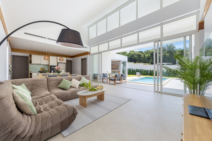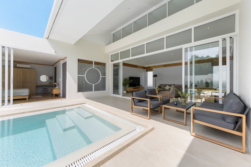 The interior design features seamless transitions between the expansive dining areas and a chef-grade fully equipped kitchen, making it ideal for both intimate family life and hosting sophisticated gatherings. Architectural highlights include high vaulted ceilings and floor-to-ceiling windows that emphasize the sophisticated neutral palette. All three generously sized bedrooms serve as private havens with built-in storage; notably, the master suite offers direct pool access and a spa-inspired en-suite bathroom finished with premium fixtures, embodying the finest in Koh Samui real estate.