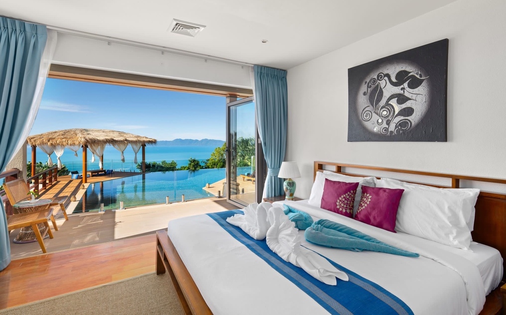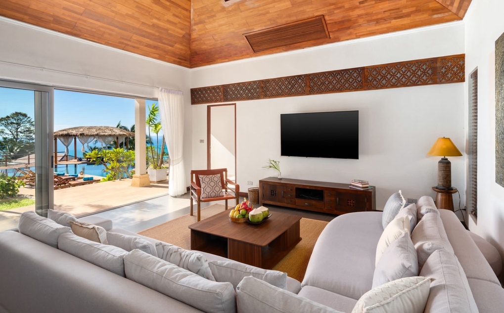 Designed for effortless tropical living, this stunning Koh Samui villa for sale features all main living spaces and bedrooms conveniently positioned on a single level. The seamless open-plan layout connects the living, dining, and kitchen areas directly to an expansive terrace and infinity swimming pool. From here, uninterrupted panoramic sea views stretch across the Gulf of Thailand, creating the perfect setting for relaxation, entertaining, or sunset evenings.