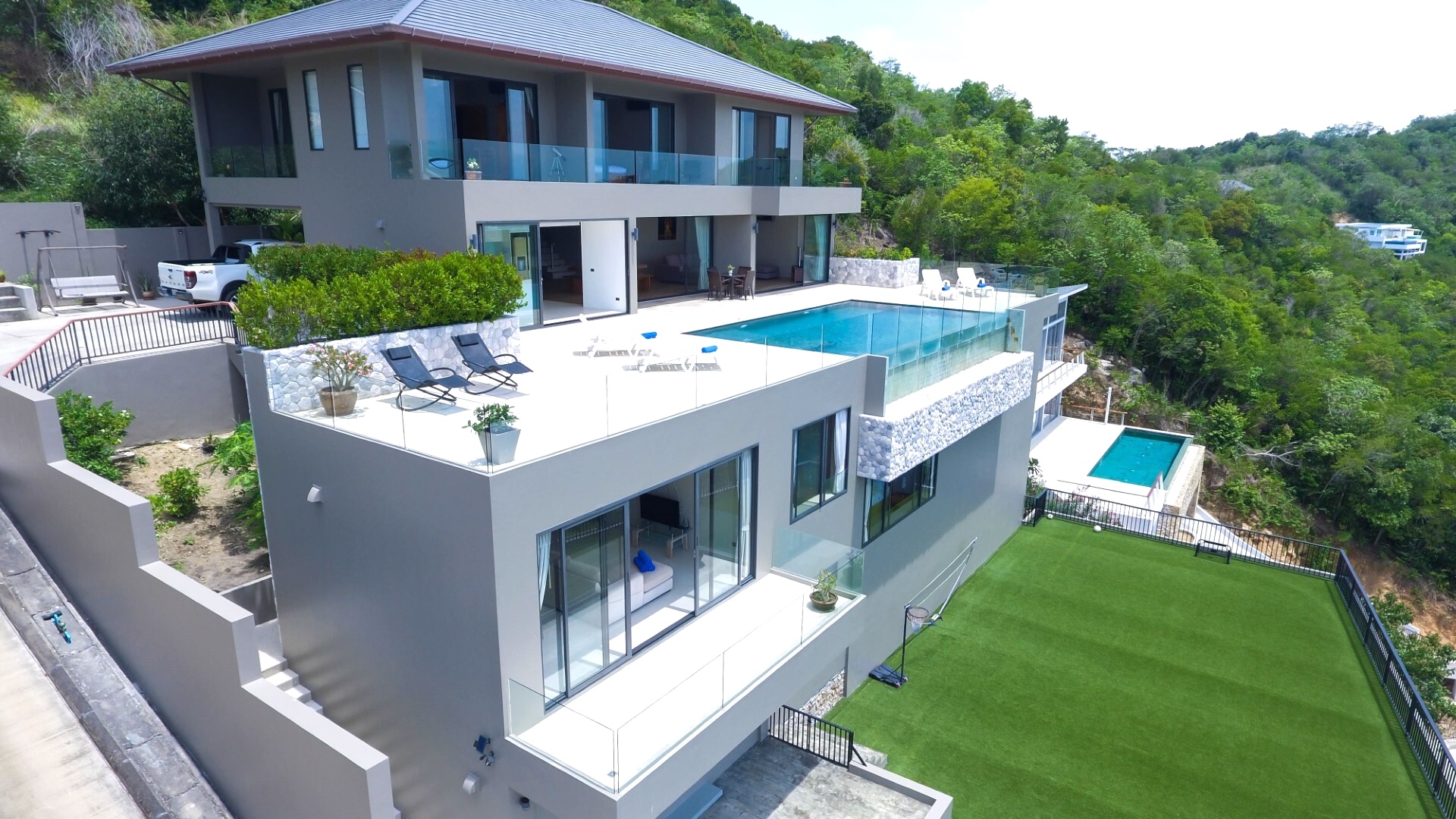Nestling in an exclusive this Koh Samui Luxury Villa is perched on a residential estate in Plai Laem. This expansive six-bedroom sea view villa exudes modern style and functionality. Spread across three levels, it has a contemporary feel with high-end fittings.