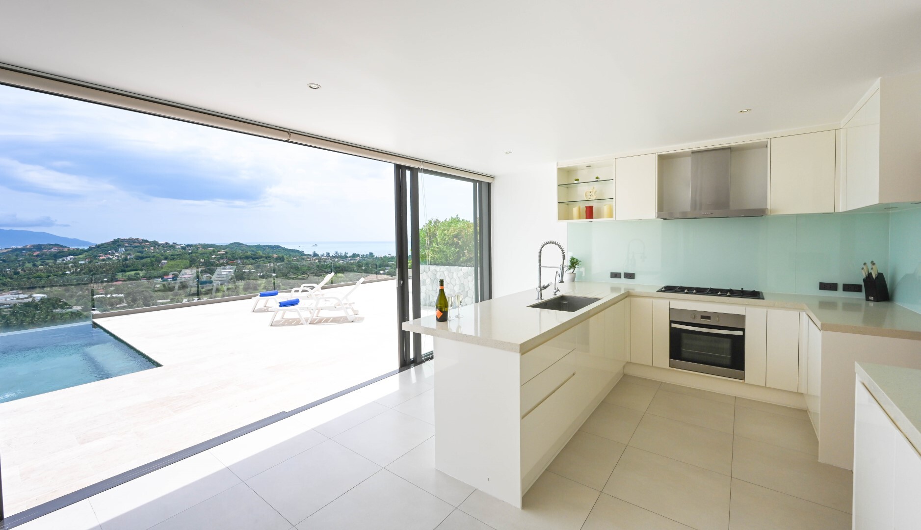 Floor-to-ceiling patio doors slide open onto a very spacious terrace and the private infinity-edge pool, for al fresco entertaining dining and recreation. The views of green hills and the ocean are outstanding.