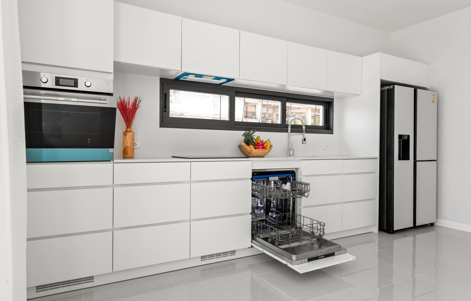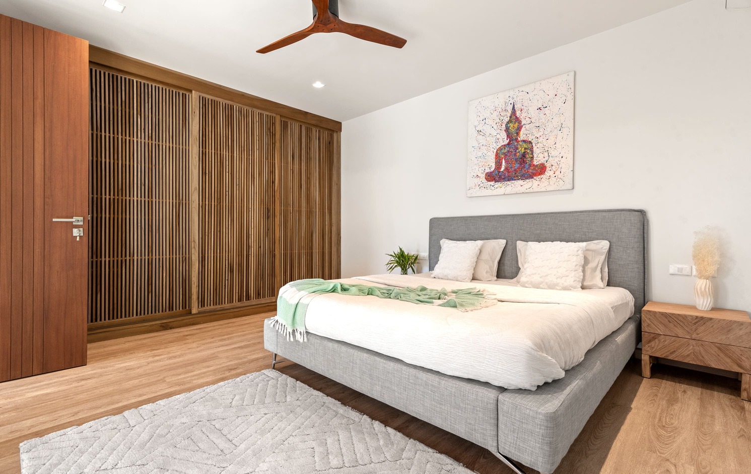 The villa provides comfortable living accommodation with three en-suite bedrooms and an additional guest bathroom. The main feature is the open-plan living room, which connects directly to a high-quality European-style kitchen fitted with premium, modern appliances. The interiors are finished with sophisticated, custom elements, including handcrafted teak wood built-in wardrobes and a bespoke wooden dining table, lending a natural warmth to the space. Offered fully furnished and appointed, the villa is ready for immediate enjoyment.
